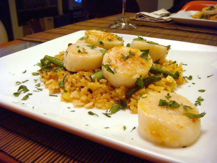 This was a pretty easy dish to put together, but messy. We used a pan that was a bit too small and shallow to stir all the sauces and rice together so there were islands of rice scattered around the stove top. Also, we do most Top Chef nights at K’s place (my TV “plan,” sadly does not include Bravo) and he has an electric stove. With small burners. Therefore, searing the scallops all at the same time turned out to be a difficult task. Some of them had a lightly golden tint to them, but none of them had the slightly caramalized crust that I like them to have. Still good though.