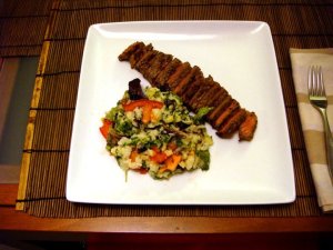 We went with grass-fed New York strip. I’ve decided if I’m going to eat meat it’s got to be pasture-raised and grass-fed and, preferably, traceable back to a particular farm and if it’s not, I will try to pass on eating it. The more I learn about agriculture, our food and where it comes from, the more important it is that the animal was treated well, the Earth wasn’t damaged and that I’m not poisoning myself by eating it. But I digress.