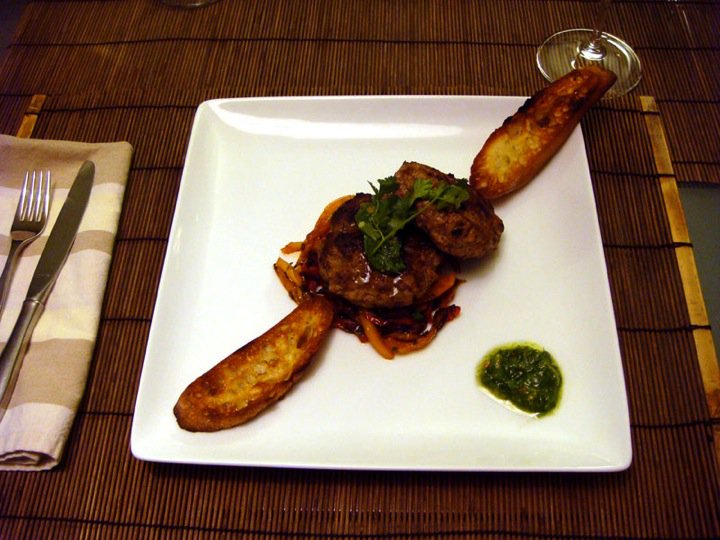 Piperade is also French and is typically sautéed peppers, onions and tomatoes, though this recipe just called for various sweet bell peppers and onion. We also made the cilantro and pine nut puree to accompany the dish. So what we ended up with was really, really moist lamb burgers with nicely spiced sautéed peppers and a cool and nutty sauce. We decided to round out our unusual “burger” with a baguette which, in an inspired moment, K threw some butter on and popped into the toaster oven to crisp up.