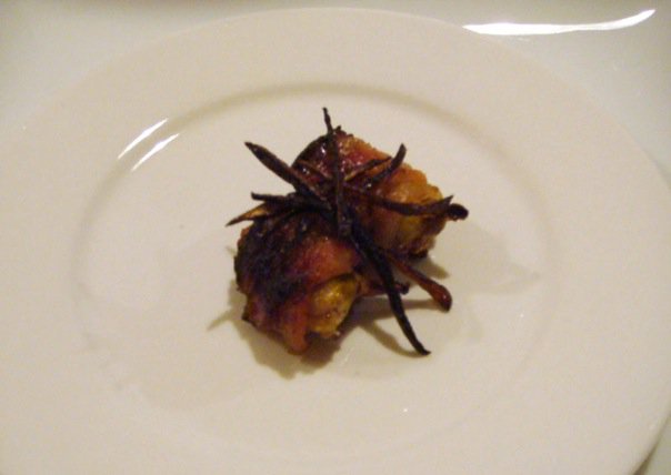 We started with an amuse bouche from Eric Ripert’s “A Return to Cooking.” I realize an amuse bouche is just supposed to be one perfect bite, but I couldn’t bring myself to only buy two figs, somehow four felt better. I’d never cooked with figs before and learned two things — figs are extremely sticky and really hard to peel. However, I persevered, wrapped those bad boys in Niman Ranch bacon and sprinkled some caramelized shallots over the top. A lot of work for two bites, but those two bites were *so* worth it. Sweet, rich, salty, oniony and they helped us focus as we moved forward in the kitchen.