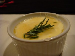 We went back to the Eric Ripert book for the dessert recipe, but his was for a lavender panna cotta. We’d recently had a blissful rosemary panna cotta at Northeast Social so we subbed the rosemary for the lavender. The recipe called for sheets of gelatin, but I could only find powdered gelatin so we had to guesstimate how much to put in. We underestimated a little so the panna cotta was a little too wobbly, but the flavors were awesome. The rosemary was resinous and piney, the panna cotta creamy and the honey (which came from a local backyard beekeeper) was sweet and luscious.