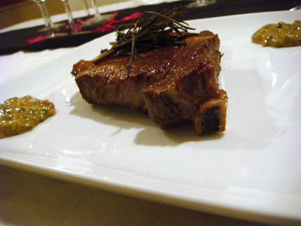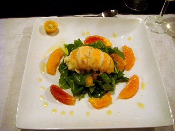 For the salad course, we managed to get a little Top Chef action into the game with this vanilla butter poached lobster on citrus arugula salad from chef Howie in season 3 (from the Quickfire cookbook). K got the messy jobs this time and not only got the lobster tail out of the shell, but supremed the citrus fruit as well. He melted an entire pound of butter, we scraped in two vanilla beans and poached the lobster until it was light and tender. We tossed the navel and blood oranges, tangerines and grapefruit with the arugula and drizzled on the citrus pepper vinaigrette. K laid the lobster tail on top and we enjoyed the delicate cloud of lobster with a soft undertone of vanilla that played off the sweet and tart citrus that offset the peppery arugula. In short — OMG. We died and went to salad heaven with this one.