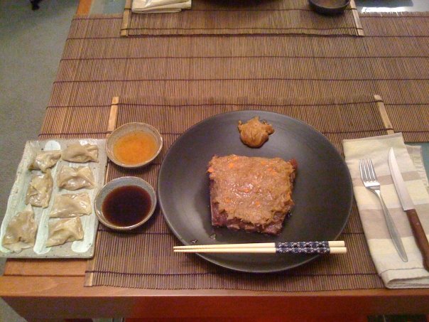 The stuffed spare ribs were not nearly as easy. This was largely because the recipe calls for bone-in spare ribs which are then cooked. You’re supposed to be able to get the bones out after they’ve been cooked. Despite K’s best efforts (and nearly taking off a finger or two with the very sharp knife) those bones were going nowhere. I’m guessing the space left behind where the bones formerly were is supposed to be the space in which to stuff the savory ground pork and glass noodle stuffing. Um, no. After diligently messing with this (and I do mean messing) for quite awhile, we went with Plan B — left the bones in the ribs and spread the “stuffing” over the top. This baked in the oven for about 20 minutes while we made the tart nuoc mam sauce and the peanut sauce.