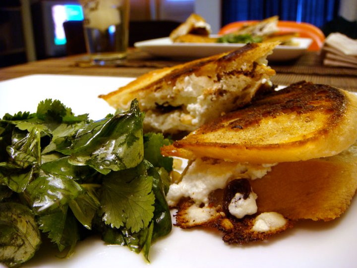 The Top Chef Masters grilled cheese challenge proved tempting for me and K. A gourmet sandwich made with butter grilled bread and melty cheese? Sign me up. And while the offerings from all the chefs looked good, we went with the feta cheese on raisin nut bread from Houston chef Monica Pope (recipe here).