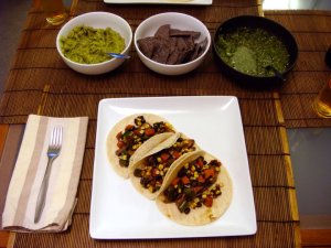 The recipe also calls for three separate salsas plus guacamole, but there are two of us so we cut out the chipotle salsa. So while K prepared the simple tomatillo salsa, I cut the fresh corn off the cob, roasted the poblano and red peppers in the oven and put together the corn and black bean salsa. K cut back on the serranos in deference to my mighty Minnesota palate (which is getting better, but is still not into super spicy foods) and, upon tasting it, realized it was still really hot. The addition of some extra lime juice and reassurance that when eaten with other food items it would be less fiery made me okay with its heat.