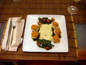 In a pan of hot oil, I sautéed the scallops for about a minute and a half on each side until the middle was still underdone and the outside was seared. Everything was ready for assembly.