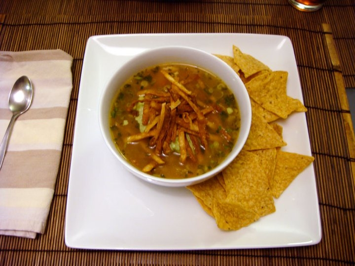 Before I even made it to K’s place, he’d cut some tortillas into small strips, fried them up in some oil and salted them. So already, yum.