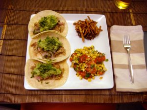 Because it was the winning recipe (and because it looked really good) we went with the pork carnitas tacos with pickled onions, black bean cake and roasted corn salad. It also helped that much of this was make-ahead. K bought a 3 lb pork butt (the smallest he could find) and put it into the crock pot with some chicken stock and spices before he left for work. He just let the crock pot work its magic all day. I pickled the onions the night before and let me tell you … pouring boiling hot water over onions really releases that acidic oniony smell *all* through the house. Before I left for K’s place, I husked the corn and put it on the grill until it was roasty and a little charred. The stage was set for deliciousness.