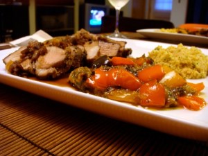 The five spice powder made the pork taste like candy and the jus was a slightly piquant and mildly oniony condiment to that candy. The couscous was nutty and the teeny tiny bits of broccoli provided a nice green freshness. The eggplant and peppers were not spicy (as the show’s judges felt they were), but were so full of savory curry flavor I couldn’t eat much. K said he really liked it (he really, really likes curry), but I think I must be a milder curry girl. With less oil and less curry powder I probably would have been able to polish this off.