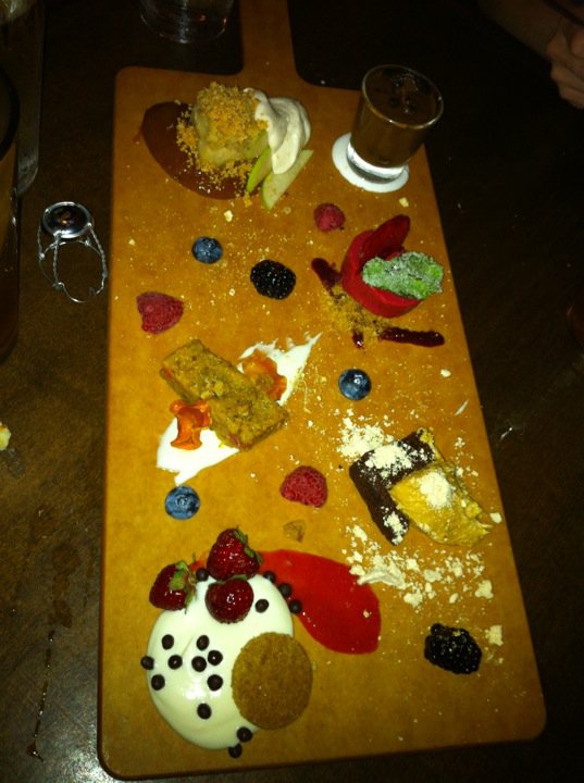 Full as we were, we decided we absolutely couldn’t miss out on what they had to offer for dessert. They brought out a plate with two pieces of cookie dough (awesome) and a cookie in the middle — peanut butter bacon. Om nom nom…best damn peanut butter cookie I’ve ever had. Then they brought dessert. Yup. The cookie dough and cookie were *pre-dessert*!! Can you stand it?!