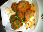 They don’t take reservations and it was a Friday night, but despite the full tables and buzzing atmosphere it only took about 10 minutes for us to get a table. We have a soft spot for strawberry basil mojitos and they had them on the drinks menu so K ordered one and I was intrigued by the ginger margarita. We agreed that the S/B mojito at the Palmer House (that originally started our obsession) was better, but that Flip Burger’s was pretty darn good. I lurrrved the ginger margarita, but wished for just a little bit more spicy ginger as promised. K flipped (get it!?! Okay, I’ll quit) over the confit duck nuggets with blood orange chili sauce and they were soo fabulous — hot, fried, dark and juicy with tangy citrus and the chili kick. Take *that* chicken nuggets!