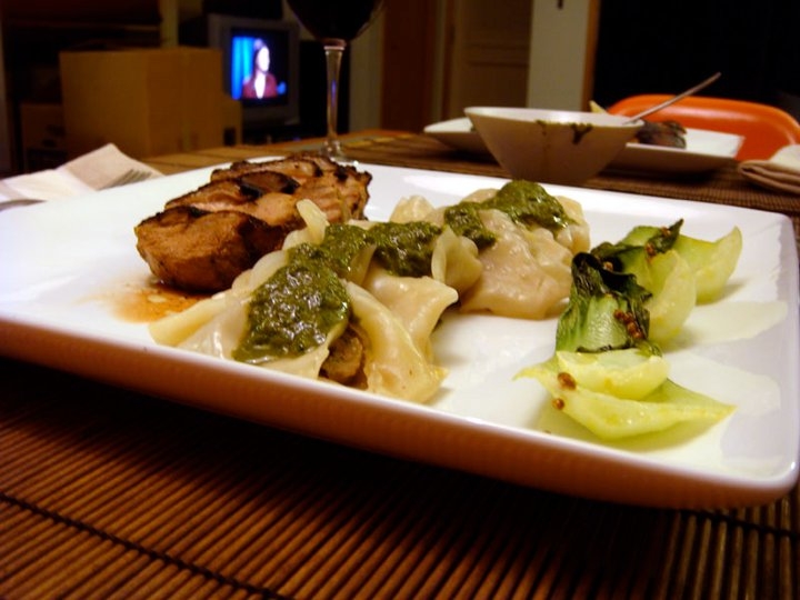 Everything finished at the same time. The dumplings were steamed, the bok choy and duck breasts were sautéed and the stock…well, the stock didn’t fare so well. Because of the fat in the skin, it kept congealing and over-reducing (depending on the temperature of the burner) so we ditched it. If we’d had four hours and duck bones, I’m sure it would have been great. The improvised version was not so good. K was also unhappy that the marinade on the duck breasts appeared to burn as they sautéed.