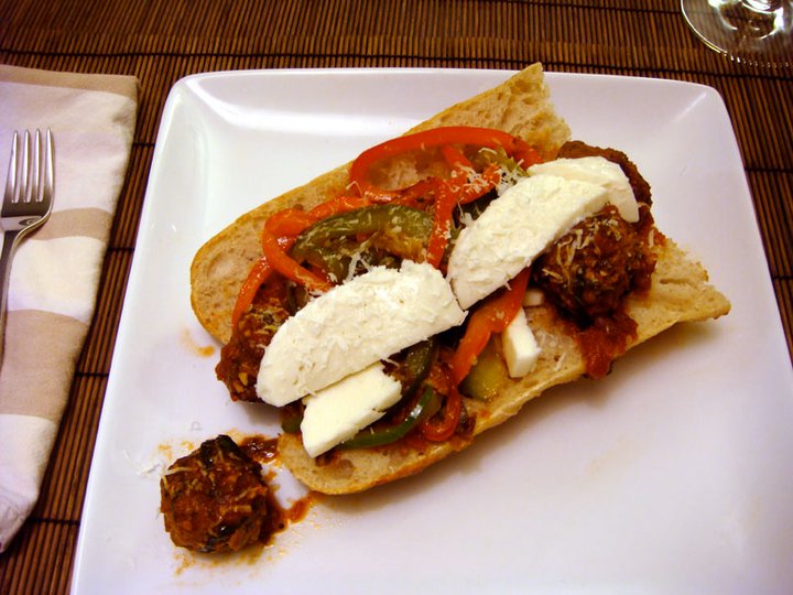 With the Top Chef finale over and the fancy duck cooked, we decided to back track to something that looked delicious from one of our favorite chefs — the Italian meatball sub by Tiffany Derry from the baseball concession stand episode. This served the dual purpose of being mouth-watering and relatively easy to make — helpful as this was our last meal in the original Top Chef kitchen (K’s townhouse) and kitchen implements were quickly disappearing into boxes.