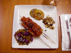 At about the same time the mushrooms and edamame were finished, K came back inside with some tasty-smelling pork skewers (and two hungry dogs nearby in his wake).