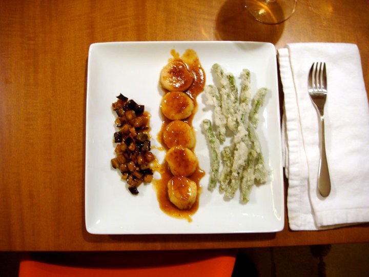 Finally all the beans were fried and generously salted. We re-warmed the pan of eggplant and K assembled the plates . Mercifully, the scallops weren’t rubbery, but were a little sweet with a little bit of scotch bite. The eggplant was good and sufficiently spicy. The beans were good, but not as good as the amount of effort led us to believe. Without the salt, they would have been very bland, but we couldn’t complain because hey…who doesn’t like fried green beans, right?