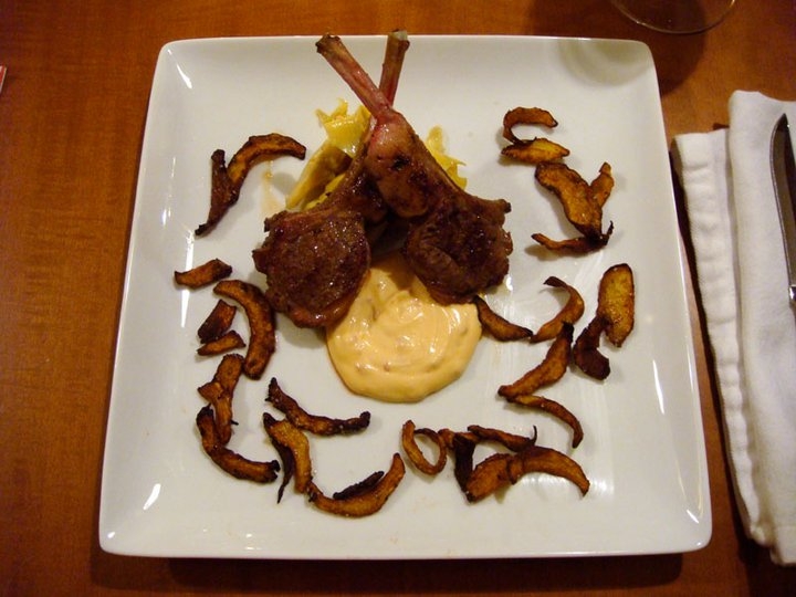 K and I put together some mayo, fish sauce, some Sriracha chili sauce and lime juice for the sambal mayo and then he was suddenly on the last batch of artichoke chips to fry. I put the lamb chops in a saute pan, tried to get them as medium as possible and zip…we were done.