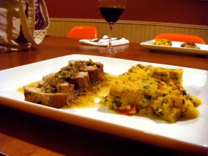 The pork and bread pudding were finished at about the same time and the our Top Chef kitchen smelled amazing. K let the pork rest for a few minutes, I let the stuffing cool for a few minutes then we cut and plated dinner. Oh my stars was it a Southwestern masterpiece! The tomatillo sauce was tart and smoky and there was just enough of it to cover the tender, juicy pork. The bread pudding was perfectly spiced, sweet with peppers, crisp and cheesy, but still quivering a bit with rich creaminess. We toasted Southwestern success with a Cline Ancient Vines Mouvedre red wine. The whole meal was, to use a dated (but appropriate) SNL reference, like buttah. We are privileged to have two families who host us for Thanksgiving every year, but if we ever host we’re ditching the turkey and Stovetop and going with tomatillo-braised pork loin and Southwestern bread pudding stuffing. And everyone would be thankful we did.