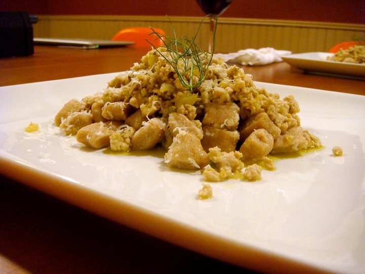 As K was caramelizing the fennel and zucchini mixture and started sautéing the pork with fennel seed, garlic, butter, chicken stock and olive oil, I began trudging through the whole wheat gnocchi. The more whole wheat flour I added, the more I feared the things would sink like lead weights into the boiling water, never to rise again.