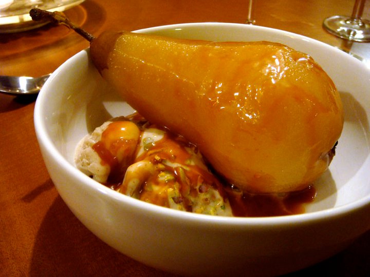 While K was assembling the salad and reducing the sauce, I filled up a huge pot with water, sugar and a vanilla bean, peeled two Bosc pears and let them simmer in the sweet liquid for about 30 minutes. Then I melted sugar in a pot before adding some heavy cream. The recipe calls for the addition of Poire William, but we couldn’t find that. We did, however, have pear vodka on hand (thanks to Master Mixologist K) and used that in the caramel instead. I also crushed up some pistachios to put into our vanilla almond milk ice cream (K is not a fan of the lactose).