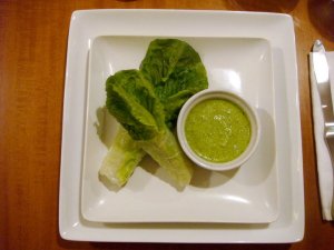 The dressing was toned down with the addition of dark green romaine leaves blended into the dressing with a bit of rice vinegar and honey. Before dinner, K took the more delicate inner romaine leaves and wrapped them in a rice paper wrapper. The “salad” was a light, crisp and fresh bundle dipped in gorgeous green, deeply flavorful dressing. An easy winner and we’ll be enjoying it again to finish off the remaining dressing, lettuce and rice paper wrappers.