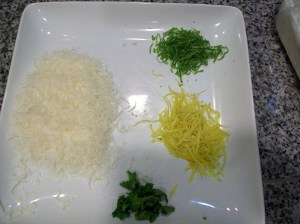 The last time we made grits it took forever. This time, I had an idea to soak them, just barely covered in tepid water, for 30 minutes. I put chicken stock and some milk in a stock pot, heated it up and added the mushy, pre-soaked grits. This turned out to be a brilliant idea as the grits turned out creamy and cooked faster than they had in the past. Okay … I have to credit a food science show I heard awhile back on NPR’s “Science Friday” show. While I was stirring the bubbling pot, K was zesting lemons and limes and shredding cheese for the grits.