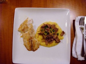 When the pork was tender and ready to be shredded and the grits were fluffy, K sautéed the tilapia in extra virgin olive oil. I added the citrus zest, cheese and a pat of butter to the grits and we were ready to enjoy the feast.