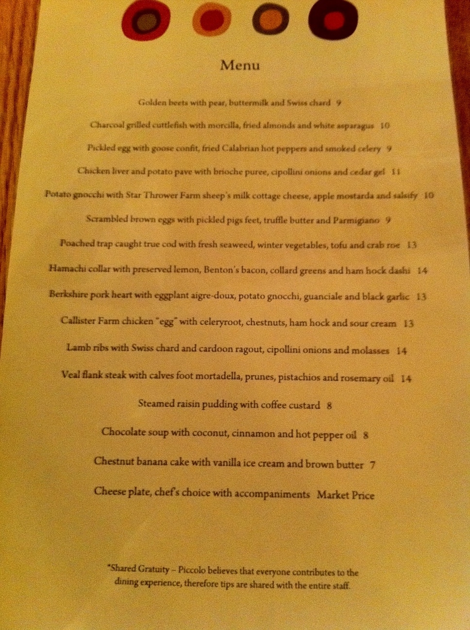 When asked to choose a restaurant for his birthday dinner this year, K didn’t hesitate in saying, “Piccolo.” We’ve been once before and had an evening full of perfect bites. For a perfect birthday celebration, you can’t go wrong with perfect bites and Piccolo didn’t disappoint.