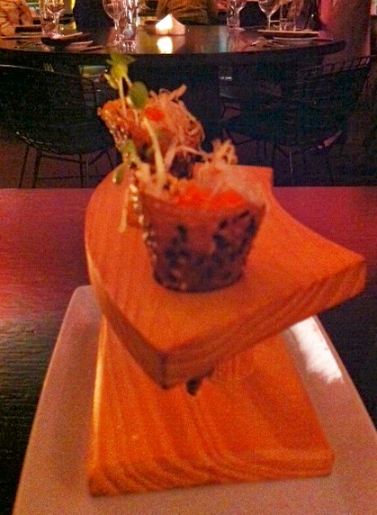 In 2009, Wolfgang Puck was in town for a fundraiser and took calls during an hour on MPR’s “Midmorning” show. I asked for his recommendation for a very special date night at 20.21 and he enthusiastically endorsed several items — one of which was the not-on-the-menu tuna cones. To start our farewell meal, we enjoyed the tiny cubes of fresh raw tuna ensconced in a small black and white sesame seed tuille cone with a bit of mysterious and delicious spiced sauce. Perfection.