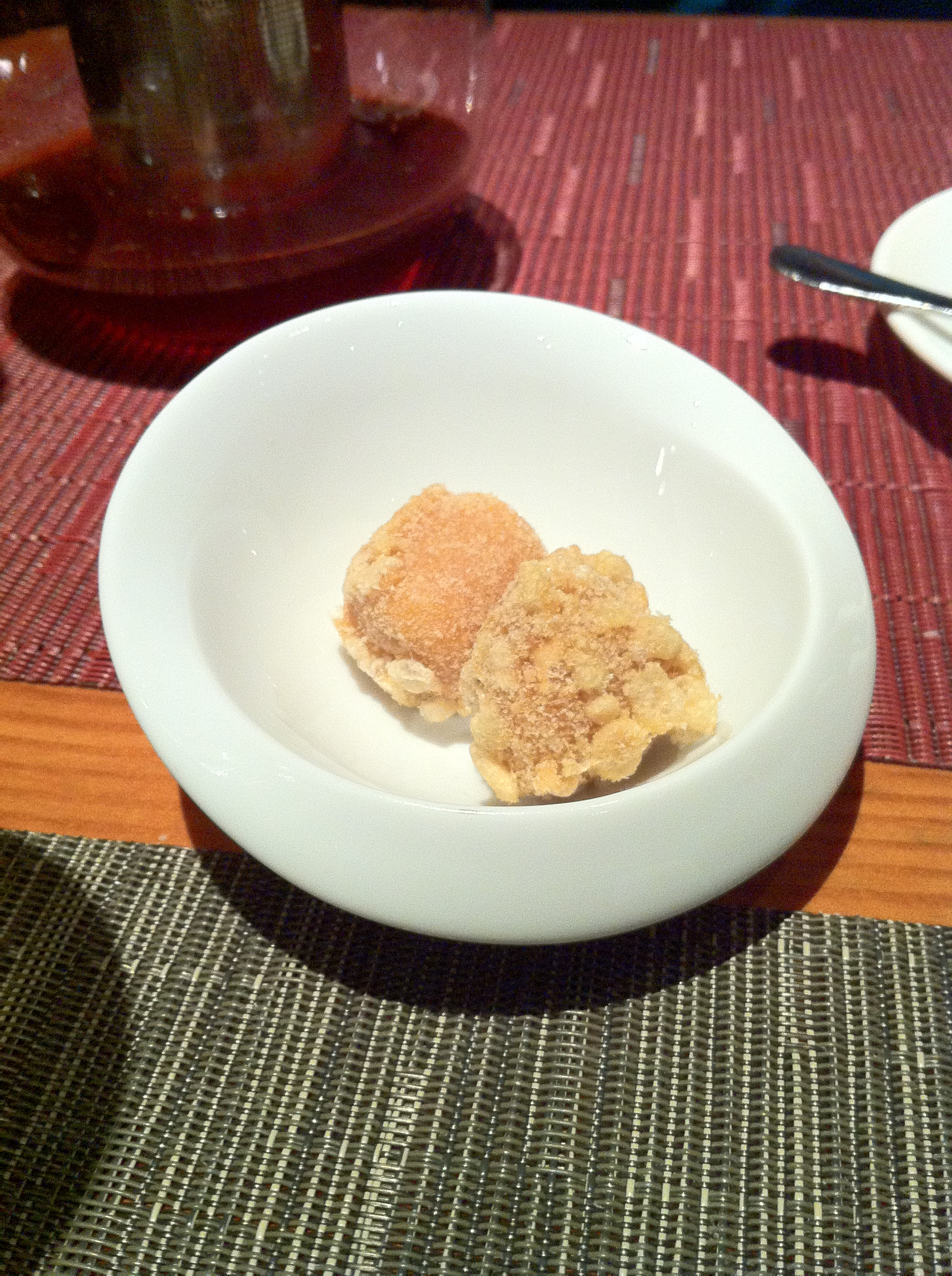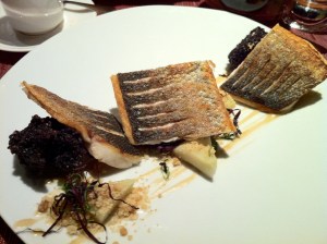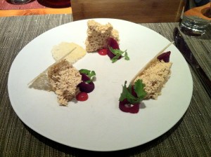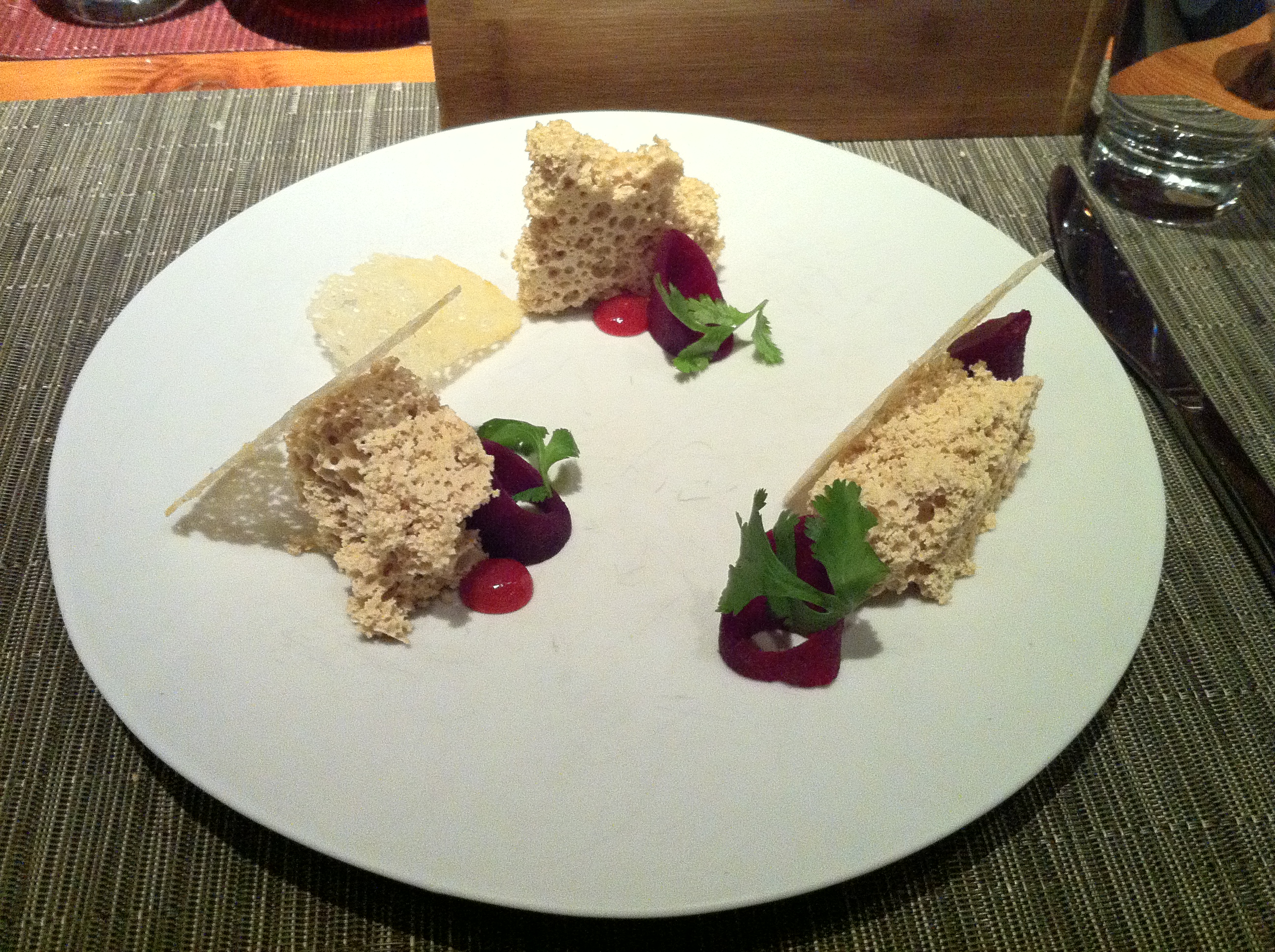 Well known for playing with his food and being something of an alchemist, Dufresne’s menu definitely didn’t disappoint. A lover of liver, K started with the aerated foie gras with pickled beet, mashed plum and brioche. The plate looks like a bunch of artfully placed sponges, but the foie was rich and vaporous — the best kind of rich (and foie) in my opinion.