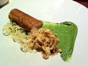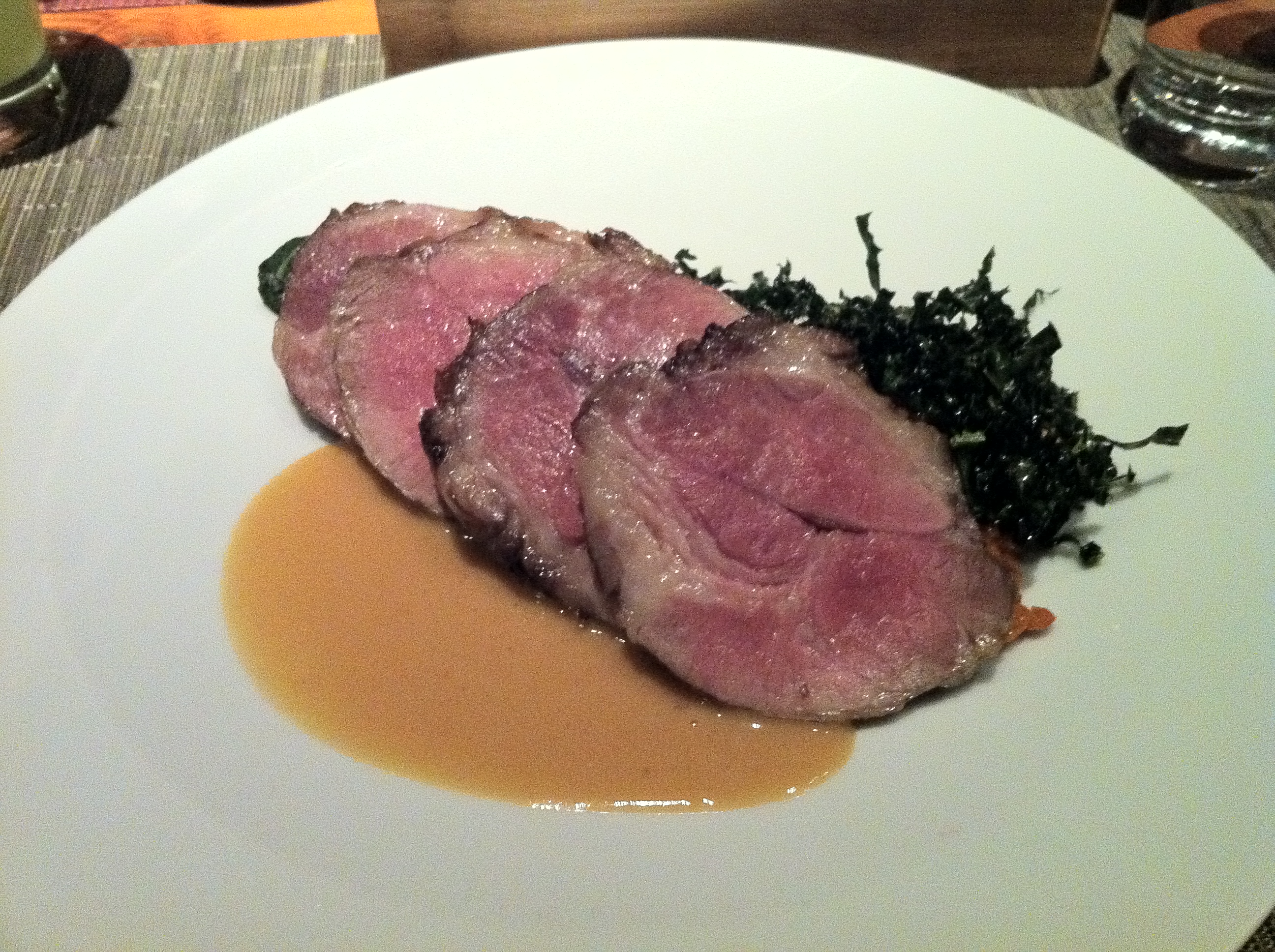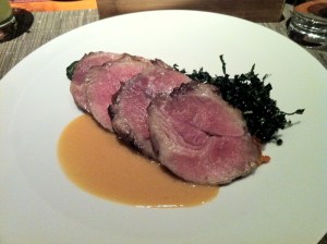 The light cocktail was a good pairing with the full-bodied entrée K chose: Iberico pork neck with smoked paprika spaetzle, peach and Marcona almond. This was the richest, most flavorful and “porky” pork I’ve ever tasted and the paprika spaetzle was genius — spirited with a dancing spice.