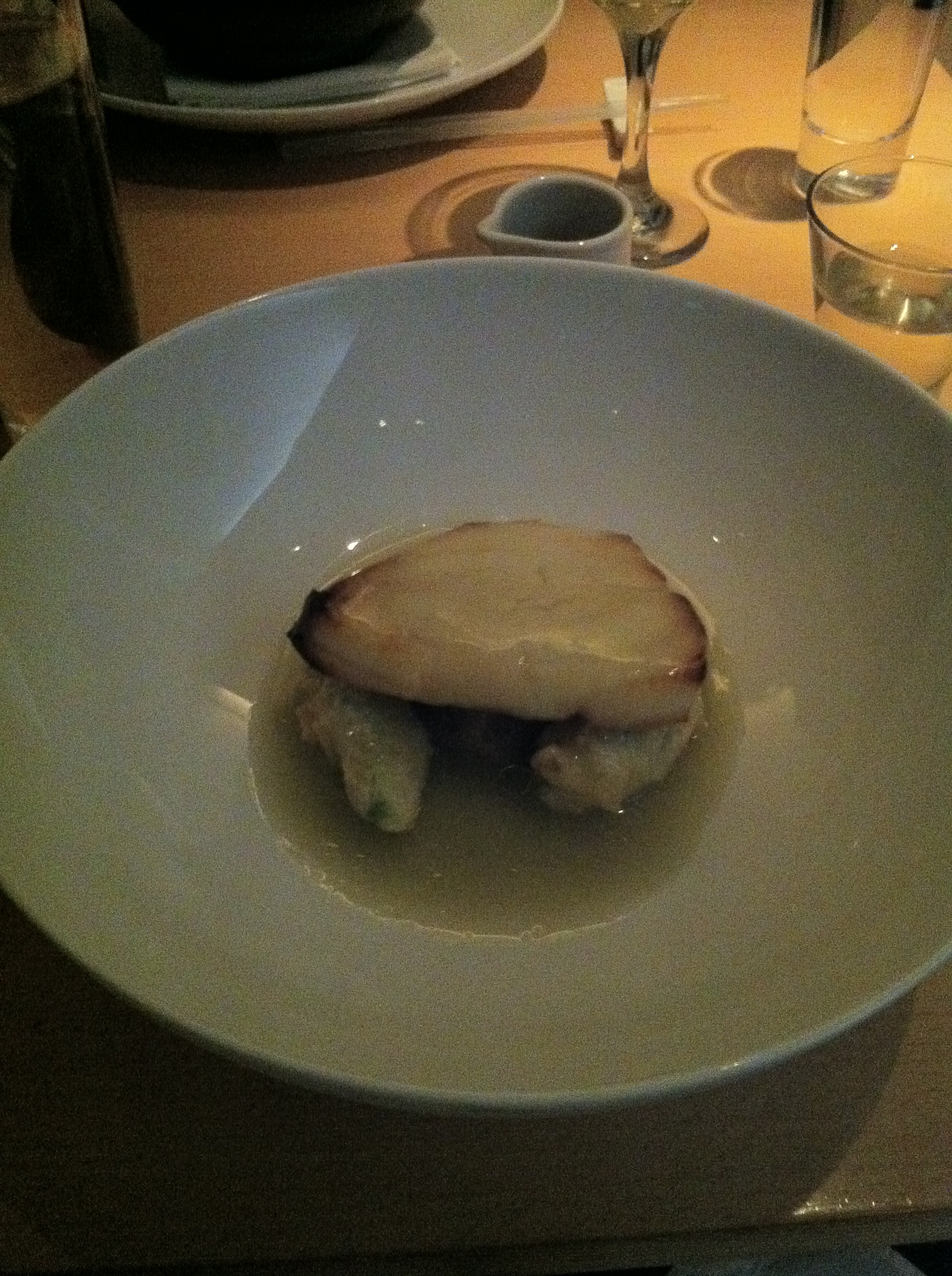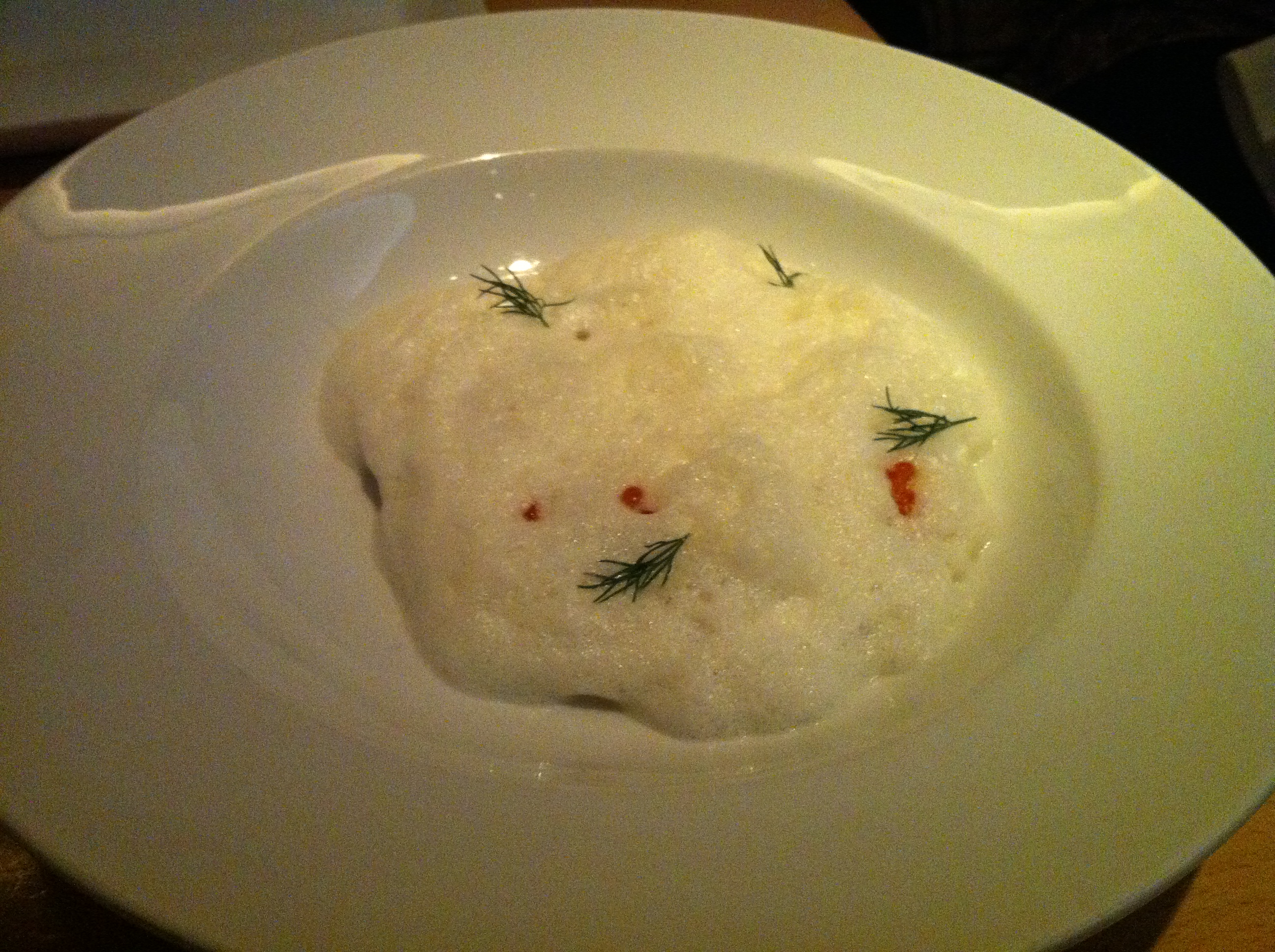 K and I shared two starters: Smoked salmon “ravioli” with dill foam and salmon roe and lobster fritters with citrus aioli. The salmon ravioli arrived buried under foam, we weren’t even sure it was in there! But the foam was diaphanous and had just the slightest hint of dill (thankfully, since it is not my favorite herb). The salmon was smoked and plush and the entire dish was light as air.