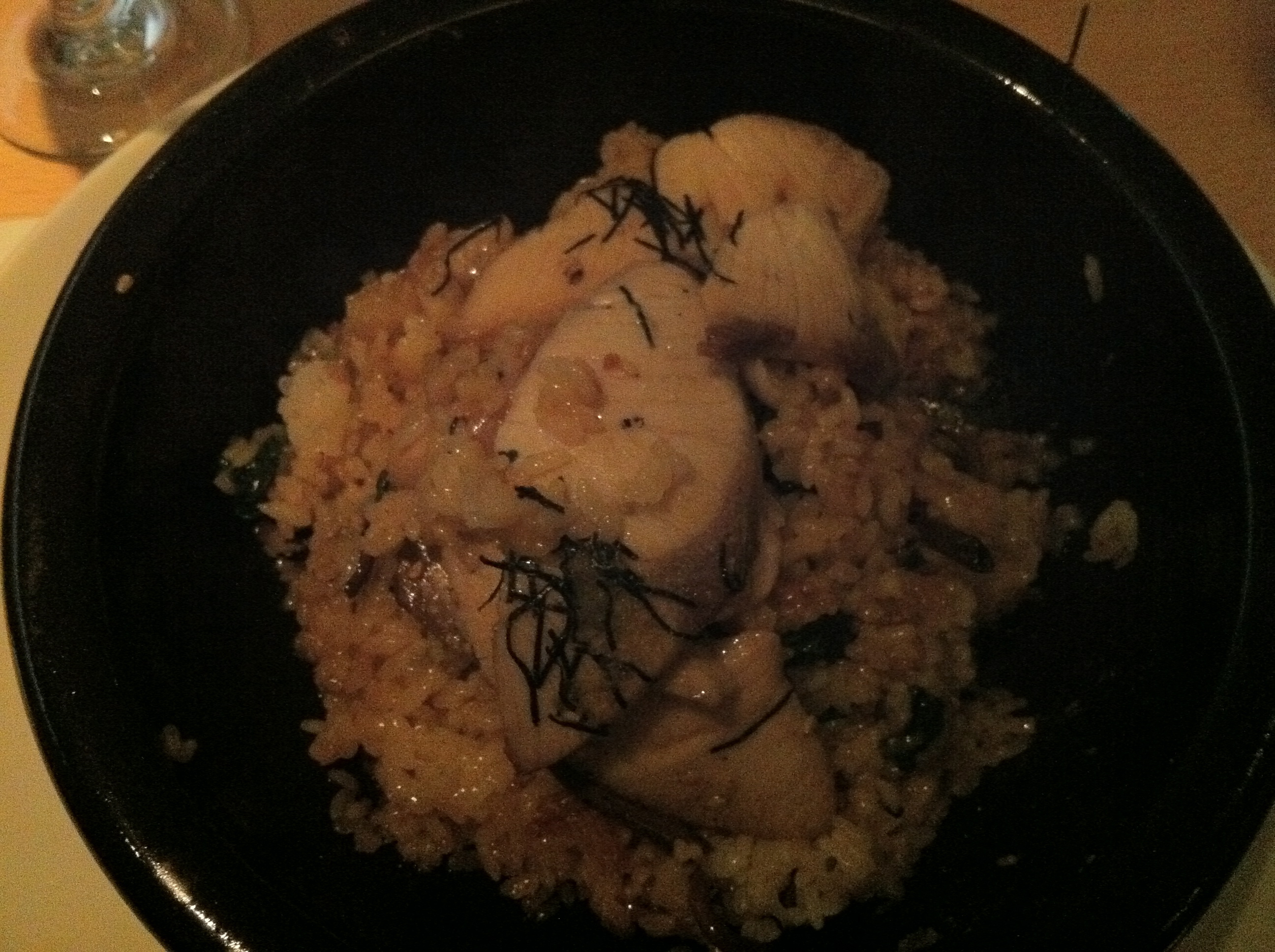 As for our entrees, K had the big score of the night with his sea bass and avocado tempura. The fish was like butter and appeared lacquered with the accompanying broth. I’d eat avocado tempura all day, every day — it’s like crisp fried whipped cream! UPDATE: After looking at the menu on the website, it turns out what we thought was avocado tempura was actually Japanese eggplant tempura. Anyone who can make eggplant taste like that kind of heaven is some sort of magician. For the record though, I’d still eat avocado tempura all day, every day.