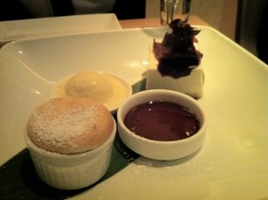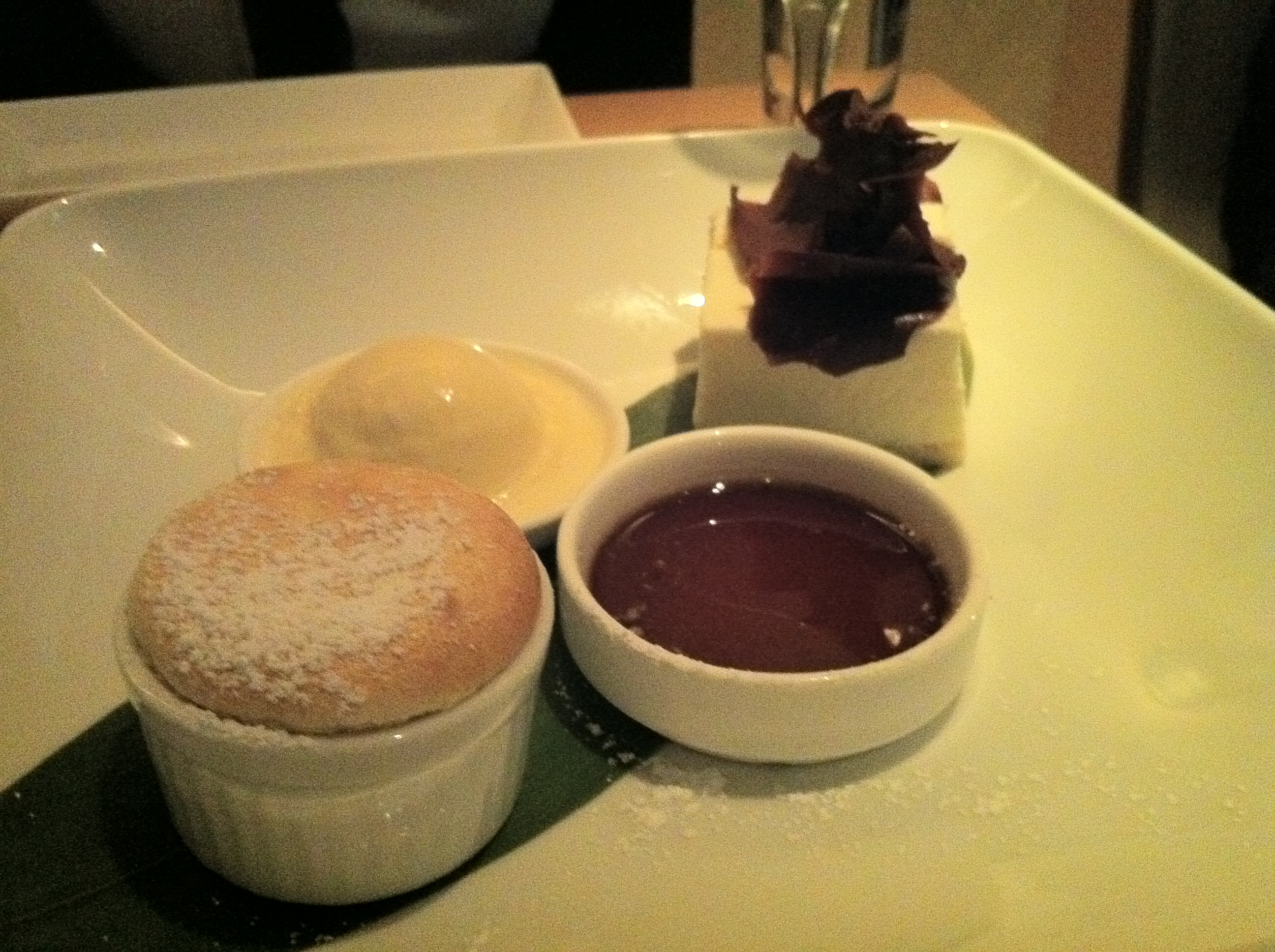 But my favorite dessert, in the top two of our entire trip, was the soy milk souffle, tofu cheesecake and maple ice cream with maple sauce. The soy milk souffle was hot and puffy and had such a creamy, mild nuttiness to it we wanted to drink it! The tofu cheesecake (which, it turns out, contains no tofu, but more soy milk) does have the texture of clouds of whipped tofu, but with a gentle sweetness. The maple sauce and ice cream were sweeter than the desserts themselves and were charming accompaniments.