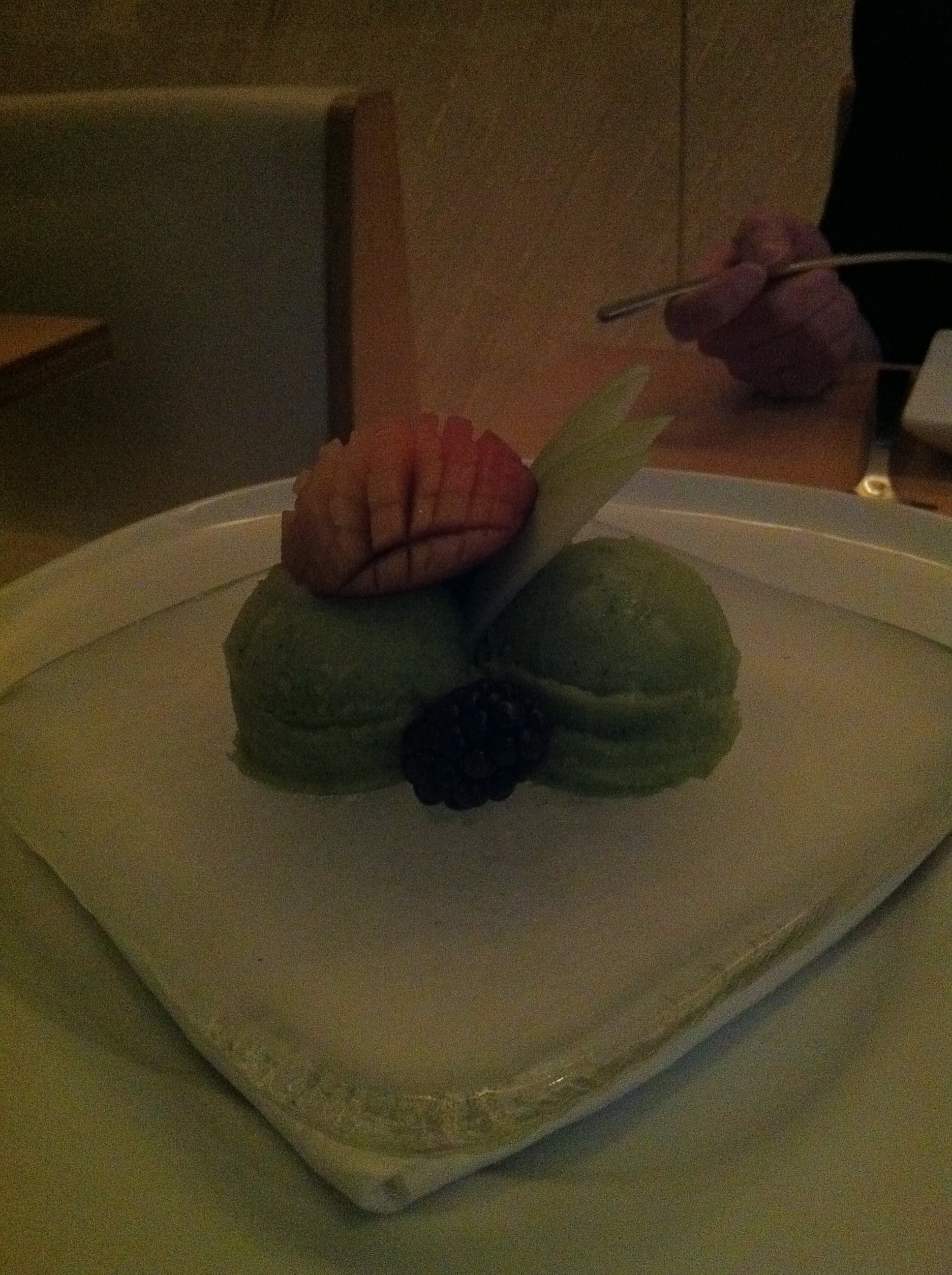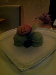 Dessert was another exercise in tempting the taste buds. The pastry chef had created a basil lime sorbet for the evening and it was presented on a block of ice. The sorbet was strongly flavored — bold lime crashed into anise basil, all to great effect. The flavors were so aggressive we could have gone with just one or two scoops instead of three.