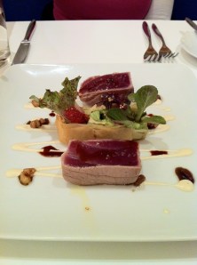 The museum has a fine dining restaurant called The Wright which has, incidentally, recently won a big design award. It was small, but comfortable and definitely high style. To start we shared pan seared blue fin tuna with a phyllo dough “garden,” sesame aioli and toasted pine nuts … mostly because we wanted to know what a “phyllo garden” was. The tuna was perfectly (read: barely) cooked. The toasty, sesame-coated veggies were a cool and fresh crisp inside the warmer crisp of phyllo dough. Pretty and delicious.