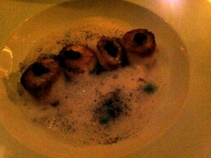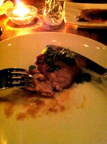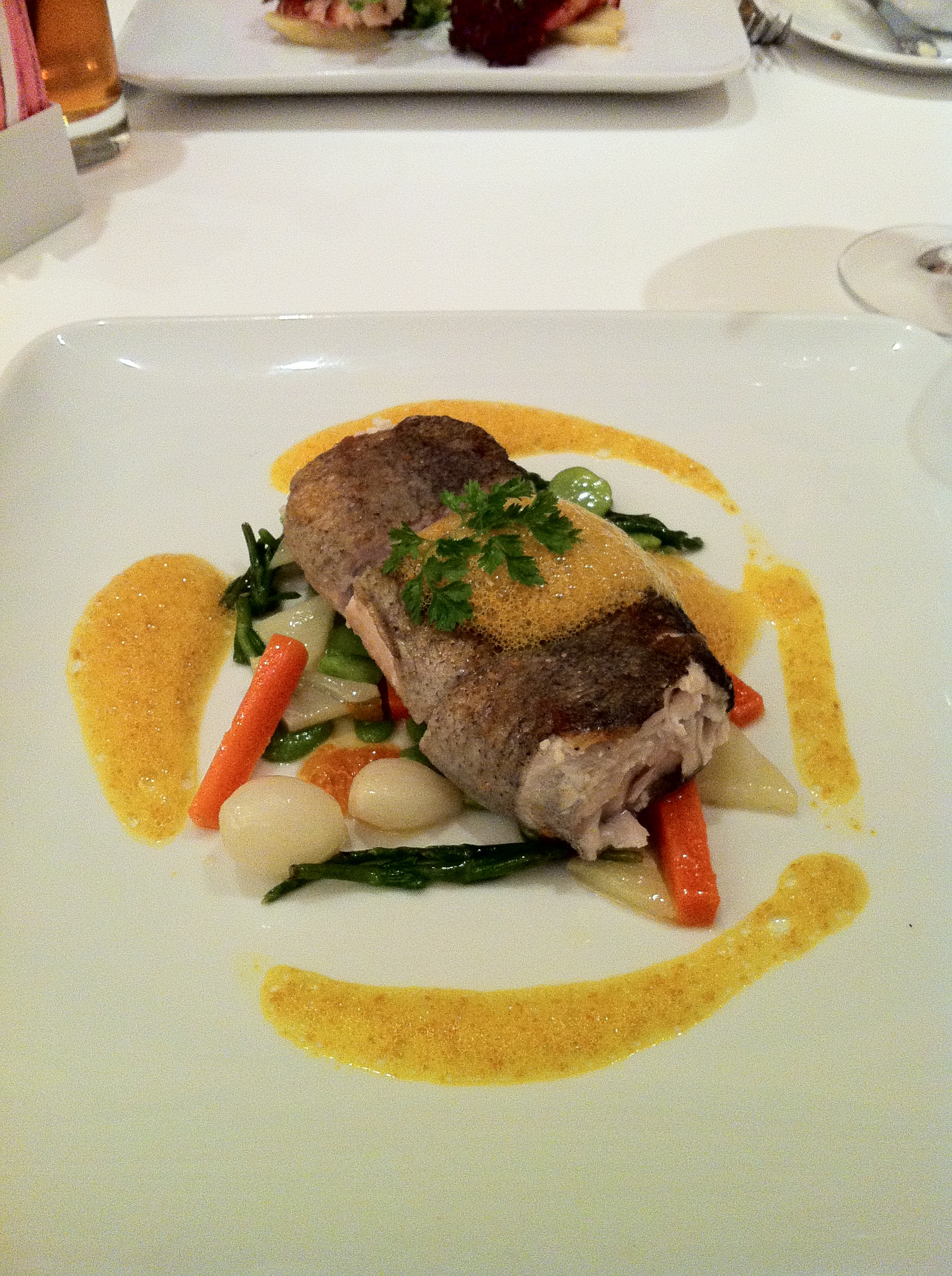 K was tempted by the pan seared trout with fennel orange marmalade on a saffron “cloud.” There was the perfect hint of saffron over the lovely fresh fish.