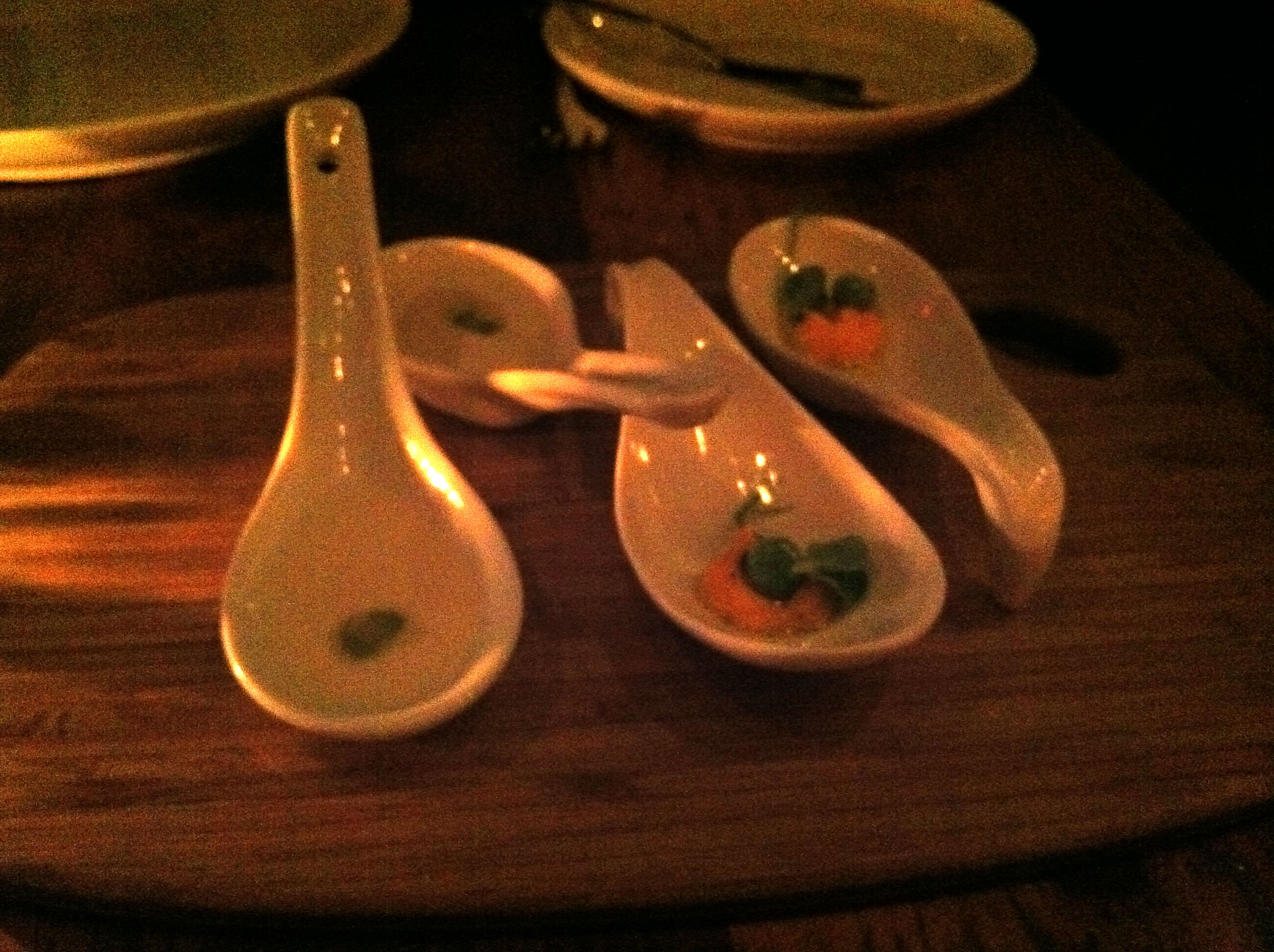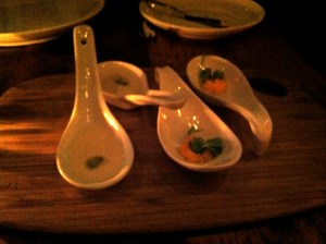 We got started with two bites — peas ‘n carrots and artichoke soup. The peas and carrots were kind of bland and pureed like baby food, but the artichoke soup was full of flavor and played over different parts of the mouth. I’d eat a whole bowl of that.