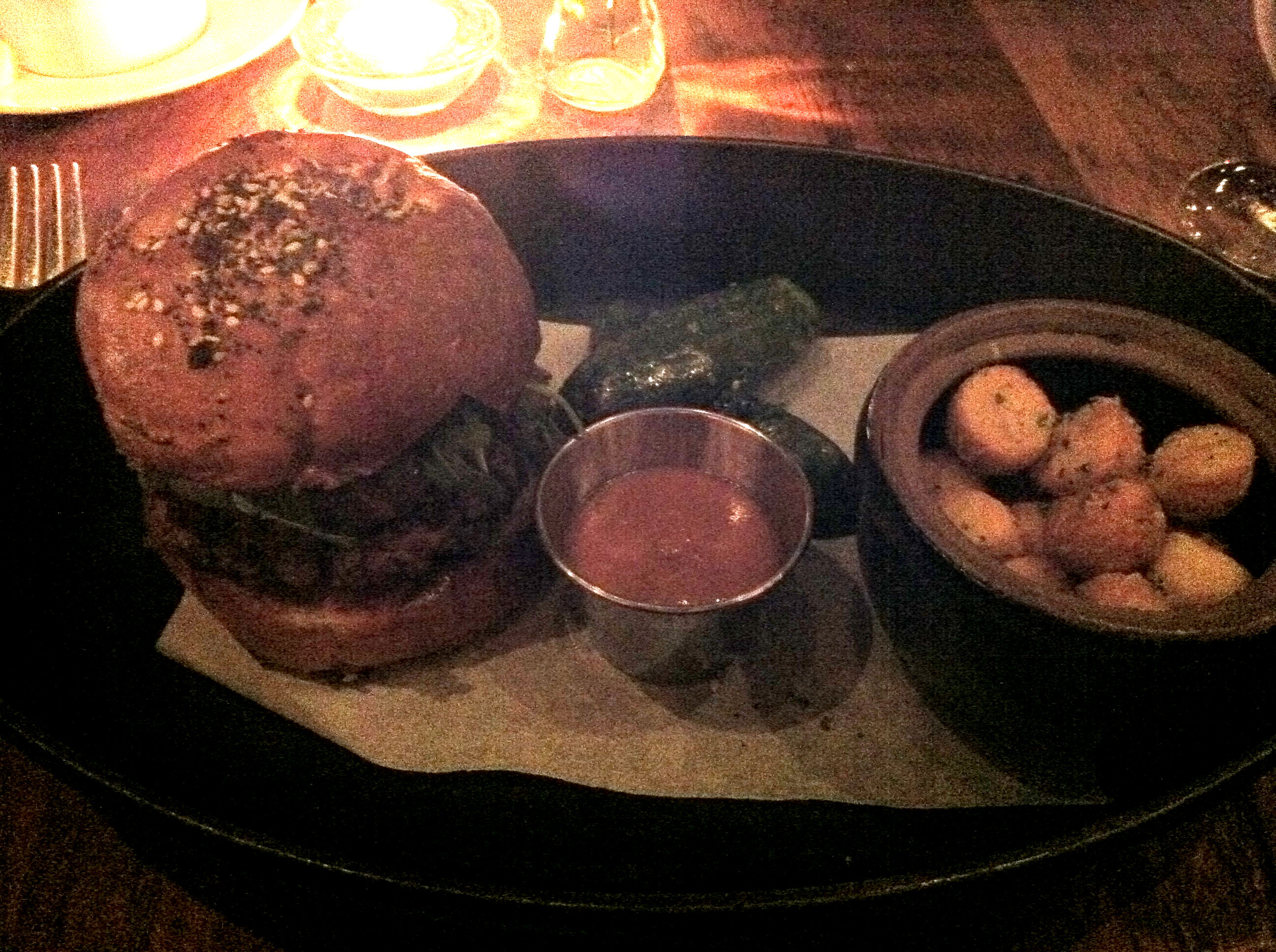 K scored BIG TIME with the special of the night — the Chef’s burger. It was 28-day aged ground rib eye with smoked bacon, homemade pickles and ginger ketchup and crispy potatoes. I was not feeling well this night and wasn’t able to enjoy a great deal of food, but I’d give just about anything to go back in time, feel better and eat this burger. The one bite I had easily made it the best burger I’ve ever tried. K agreed. The meat was so juicy and beefy and the taste just kept getting better and deeper and smokier with each bite. And those tiny toasty potatoes, delish.