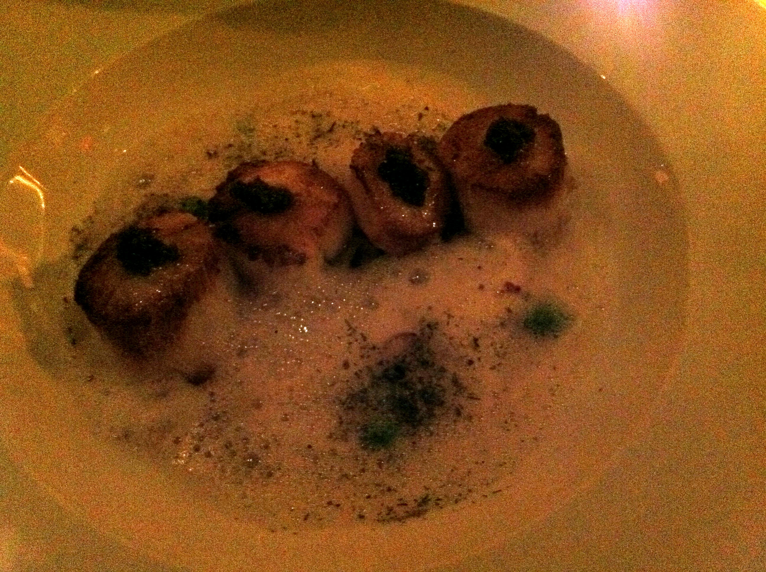 I went a small, safe route with seared scallops and white asparagus. The scallops were so fresh I could still taste the ocean in them, but other than that it was a pretty unspectacular dish. Really good, just no big deal. I have more to say about that one bite of burger than my entire dish.