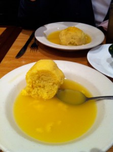 Yes, that really is the color of the matzoh ball soup and there is not a speck of green in sight. It’s very basic, but also very good. Rich chicken flavor with light-as-air matzoh balls. How they accomplished this with matzoh balls bigger than a softball (I’m not joking), is beyond me. I guess that’s why they’re famous.
