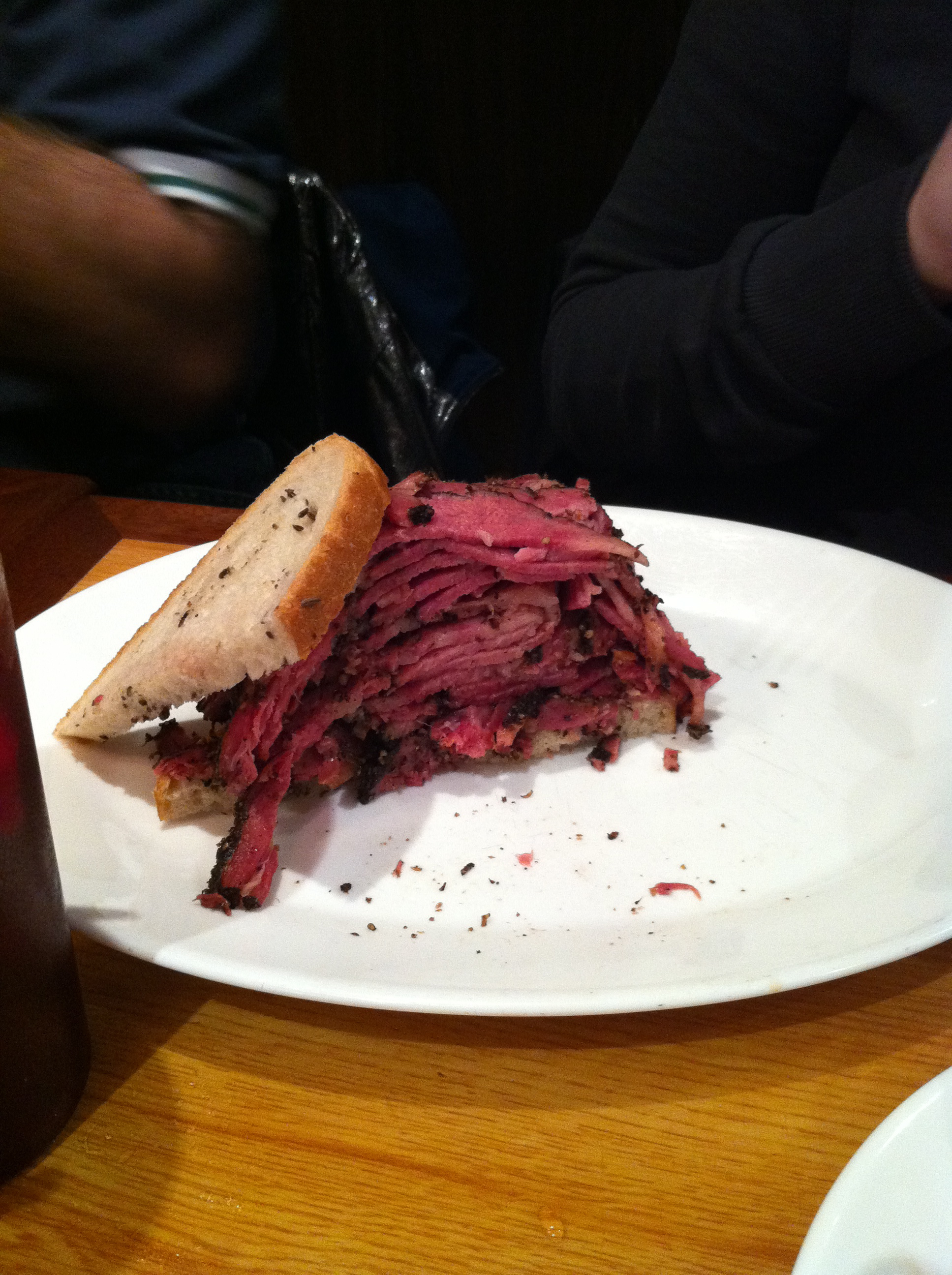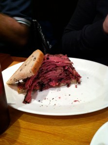 Above is half of the pastrami sandwich and it takes up much of the plate. I didn’t even bother with the bread and just went for the warm, tender, peppery pastrami. It was my kind of sandwich — just good, simple filling and nothing like mustard or mayo mucking it up. Of course I couldn’t finish my sandwich half and our server seemed really disappointed in me. She helpfully suggested my already full stomach might have room for a glacier-sized piece of cheesecake and I had to politely decline. She was disappointed in that too. Kind of like when my grandma used to shake her head sadly and tell the grandchildren, “Well, I guess you’re not a member of the clean plate club.”
