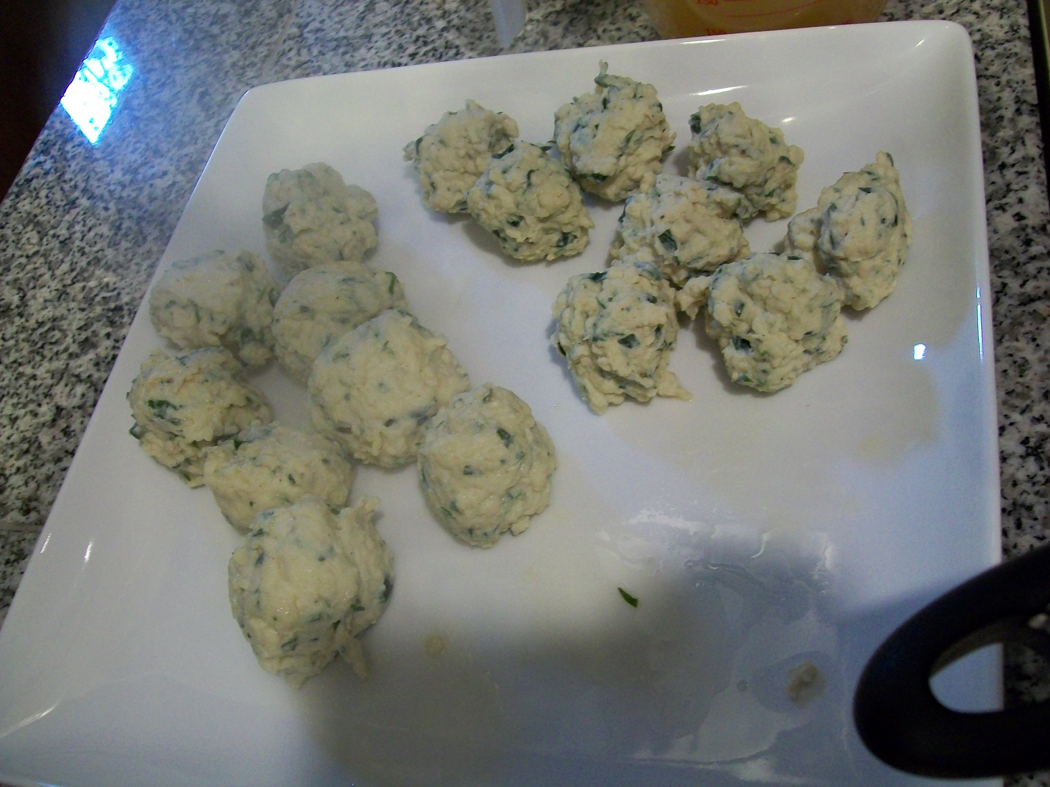 Purchase already ground chicken. Mix all the ground chicken with cold cream, egg whites, herbs and seasoning. Use a fork or your hands. Boil chicken stock (use stock in a box). Set aside one cup of broth for later. Poach meatballs in boiling chicken stock. Once poached, remove meatballs. Take a moment to note that upon immediate removal, meatballs are big and fluffy and that when they cool they shrink. Take a picture of said phenomenon. Make sure to get steam *AND* pot handle in picture.