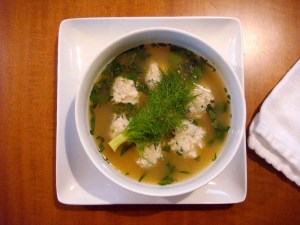 Add fennel (even better if it is beautifully brunoised by K). Boil five additional minutes. Add meatballs back into poaching broth, add remaining fresh herbs and additional stock. Eat dinner.
