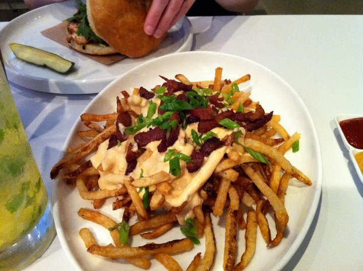 Much more impressive was K’s choice of the $100 Burger (a burger stuffed with short ribs with foie gras sauce) and the bacon gouda fries we shared. The bacon bits were a bit too large and chewy to be supported by the fries, but suck it up, soldier … just pick up the bacon with your fingers!! Evil, evil goodness. K also really enjoyed the pickle which, he believed, was made with rice wine vinegar. And we both enjoyed sipping from the very strong cilantro pineapple margarita.