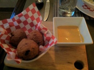 On our first night, we decided to go to chef Celina Tio’s Julian. We’d seen Tio compete on both “The Next Iron Chef” and “Top Chef Masters season 3” and were unsure of what to expect. Perhaps because of this, we were blown away by the honest, simple and simply delicious food we found. With their HVAC system on the fritz, the small dining room was really hot and stale (not helped by sitting directly outside the open kitchen window), but the heat was soon forgotten as we crunched our way through smoked chicken tamales with a spicy guacamole sauce and hush puppies with harissa aioli. The chicken tamales were melt-in-your-mouth delicious and the hush puppies, while a little too bready for me, were still nice and pillowy crisp.