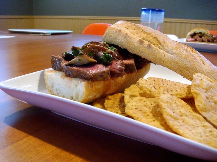 I couldn’t find ciabatta rolls at the co-op, but I found mini baguettes so we toasted them lightly and piled everything on top. A few sweet potato chips on the side and we were ready to take a breather from the craptastic week with a fantastic sandwich. And fantastic it was. The bread was crispy on the outside, but still pillowy soft on the inside. The meat was tender and juicy. The mushrooms were robust and the parsley vinaigrette was vibrant and cool. The bread soaked up all the delicious juices too, I love it when that happens. It was the perfect antidote to a long week and a quick, simple dinner.
