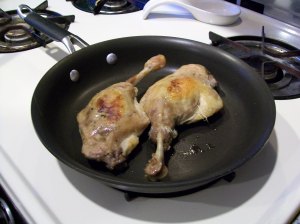 So when I came across a recipe from Top Chef winner Stephanie Izard for duck with miso-almond butter (click here for recipe), it seemed like we might be able to rock some duck confit. While the recipe calls for uncooked duck breasts, K agreed to substitute the pre-cooked duck confit legs and we were off and running.