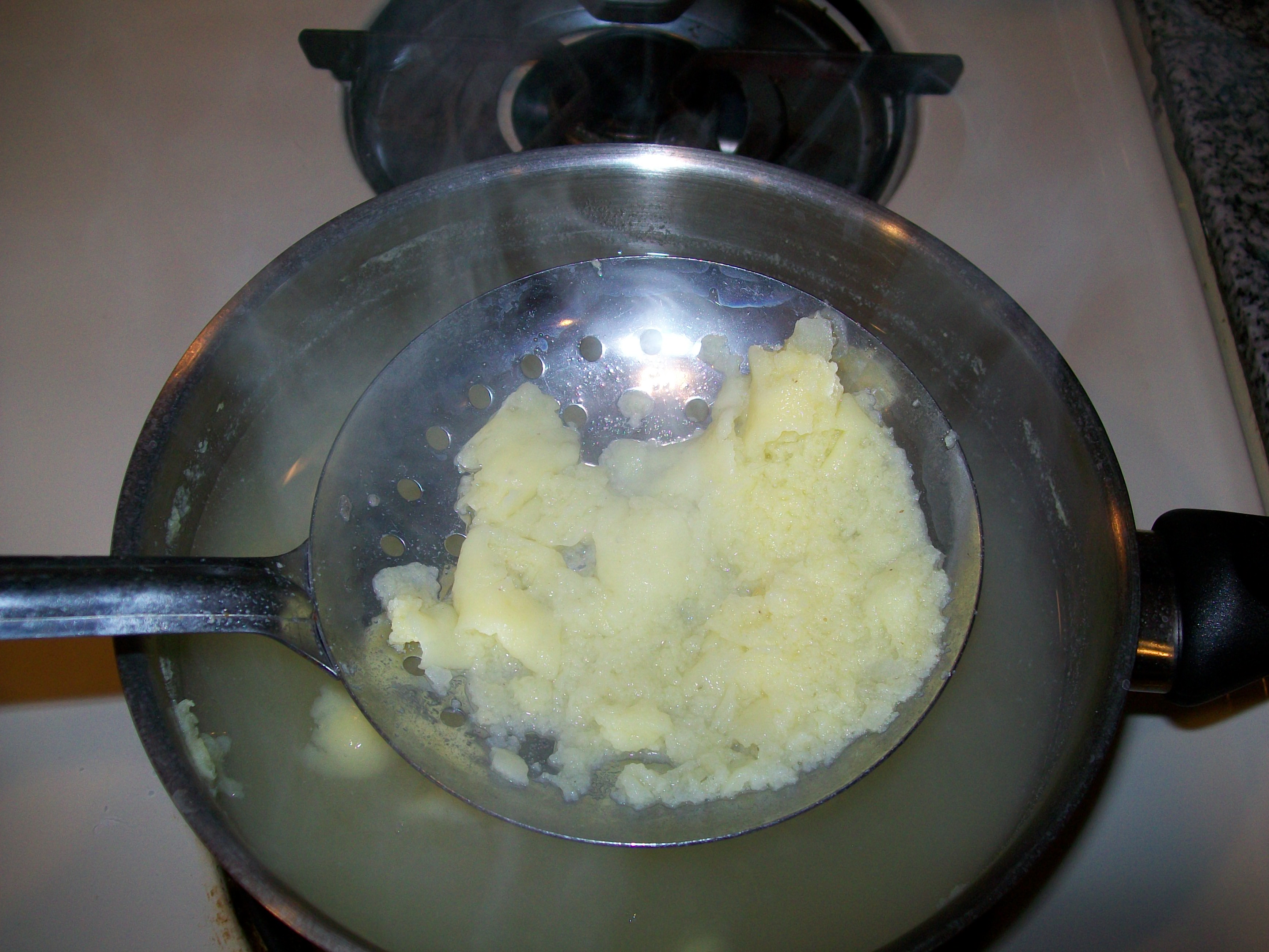 Yes, that is a disgusting pot of hot, mushy potato water. It tastes like water, but with a smack of mushy potato. This is what happened with about 1/3 of the gnocchi dumplings before I freaked the hell out. Immediately, I got out the flour container, smashed all the remaining “gnocchi” back into wet potato form and started adding flour until they actually formed appropriately firm little potato dumplings. I realized I should have trusted my cooking instincts. There was not, in fact, nearly enough flour in the recipe.
