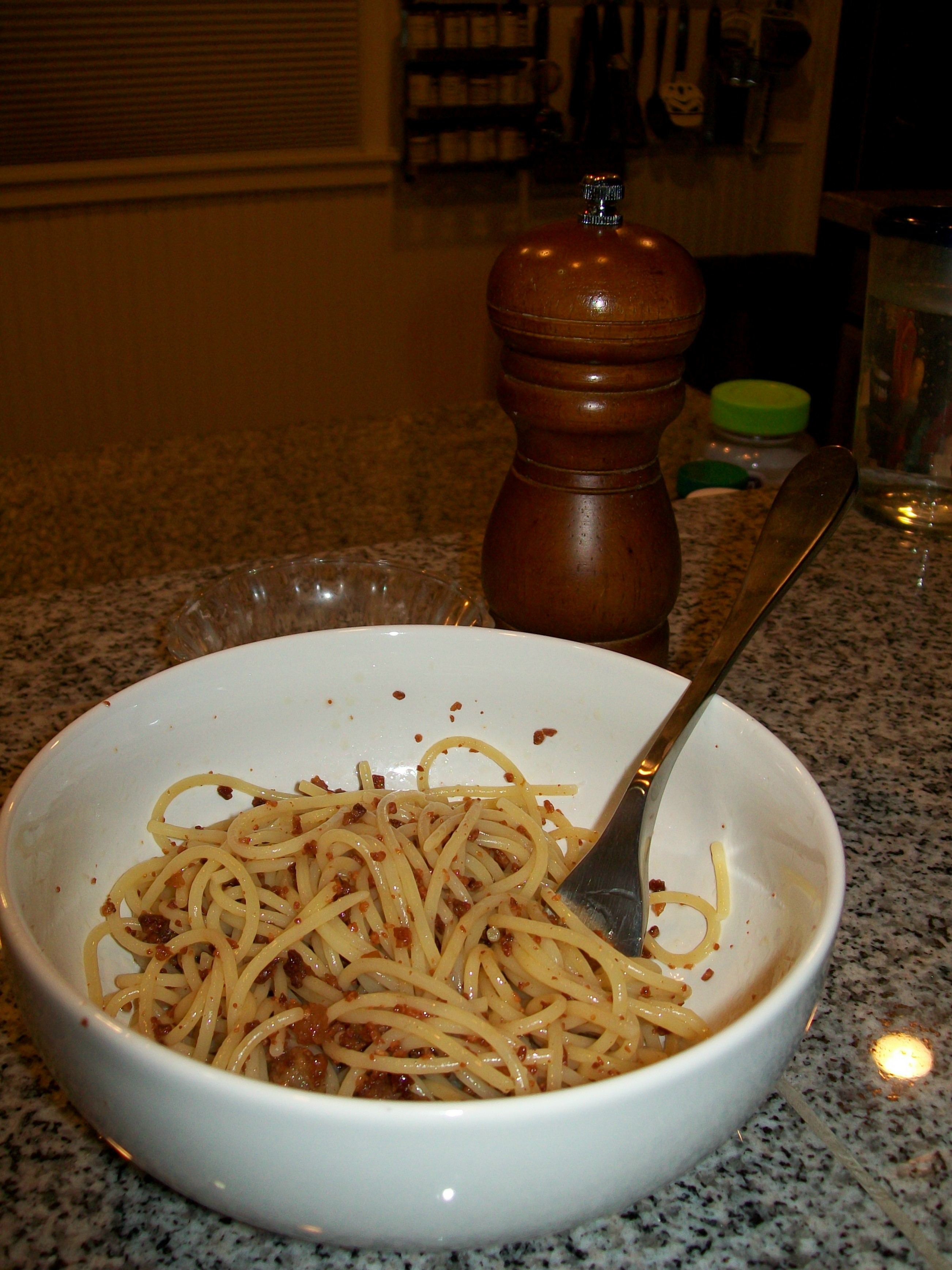 But here’s where the ode to leftovers comes in. Because we could only use a small spoonful of the pork filling in each ravioli, quite a bit remained. Two nights after Top Chef Night, K had a genius idea — use the pork filling to make a version of spaghetti a la carbonara (a la as we did here). He sautéed the guanciale/pancetta mixture until everything was hot and crispy then we tossed in our cooked spaghetti (from a box). It was amazing. A case in which the leftovers were a much better use of the pork than what it was originally intended for. Simple, salty, crisp, lip-lickingly delightful. Thank you, leftovers, for taking a disappointing homemade ravioli experience and turning it into a tasty, comforting, warm and relaxed dinner.