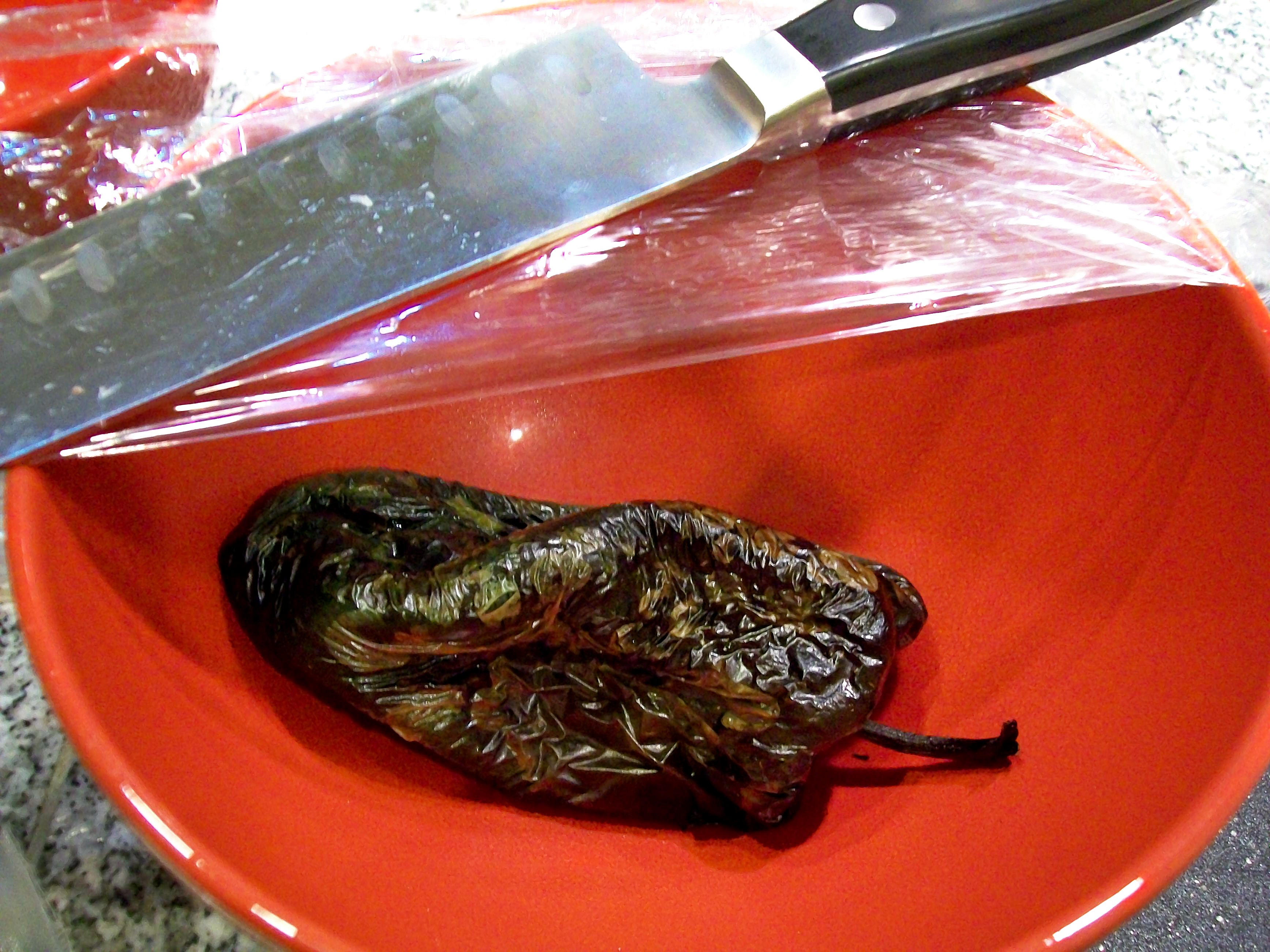 Roasted poblano, skin steaming off while chilling out (which is what I should have done).